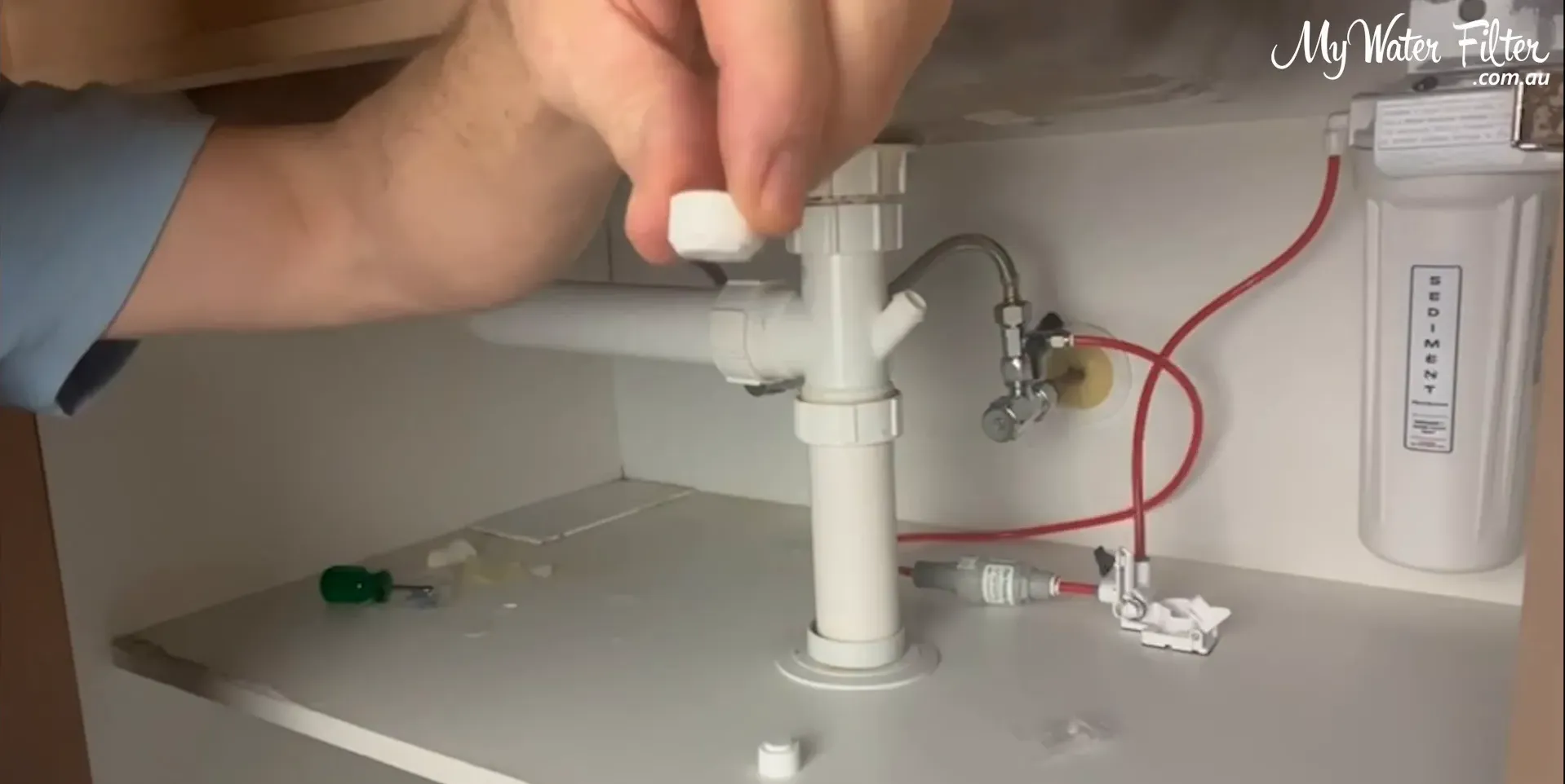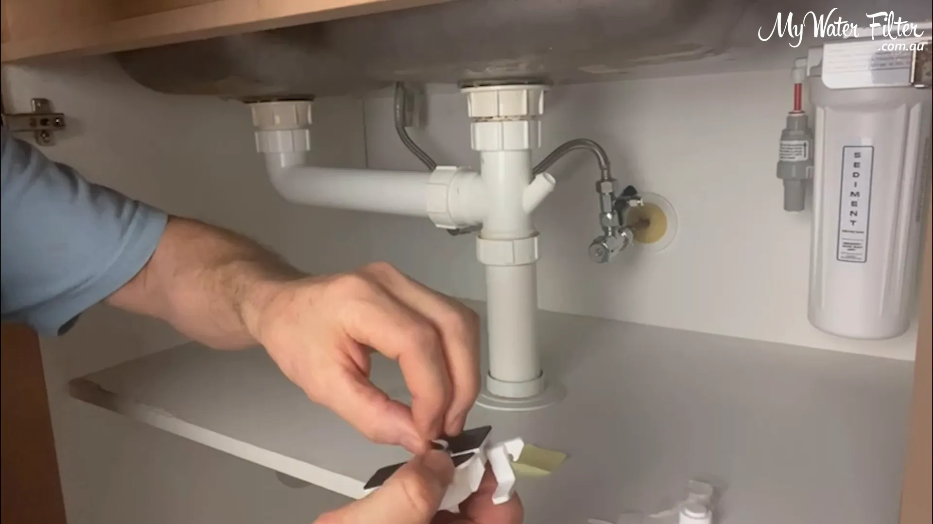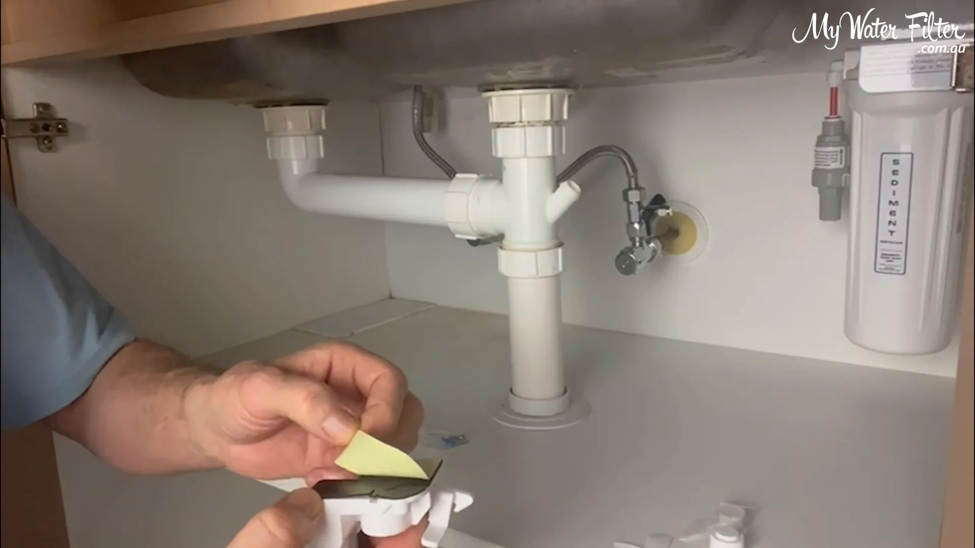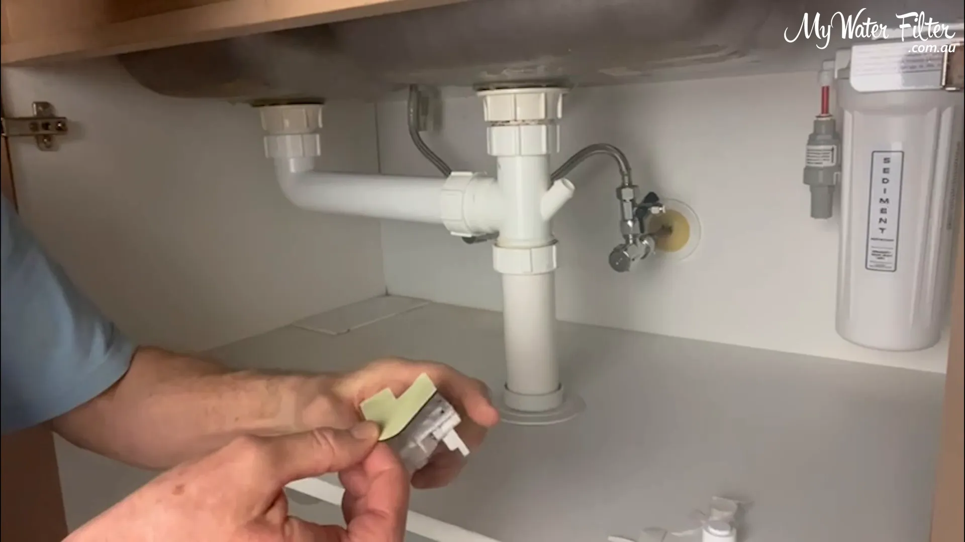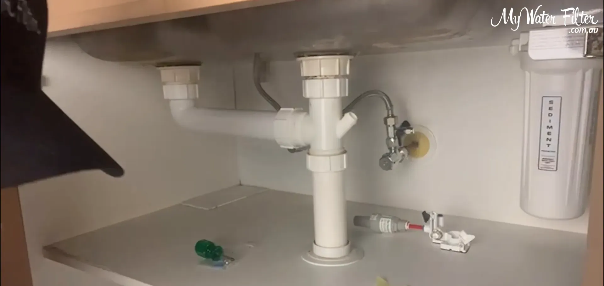 We always locate the lowest point in the cupboard so any escaping water will flow to the detector. A quick trick: drop a little water and watch where it pools. In our example the water tracked to the back area in front of the filter and T‑piece.