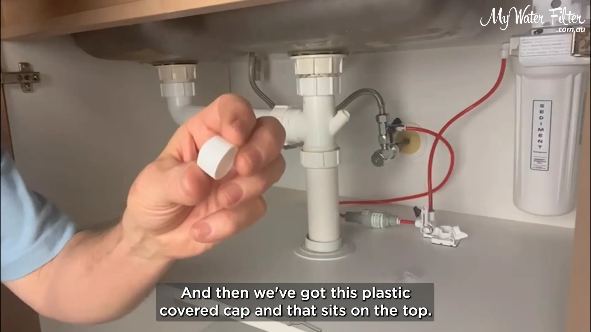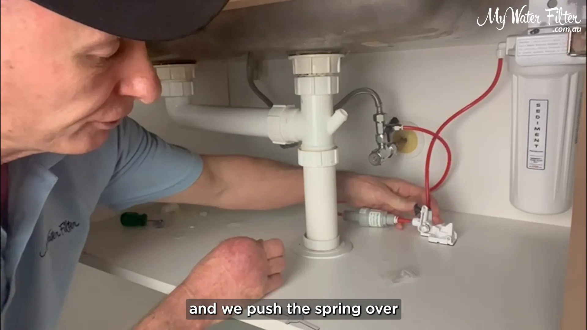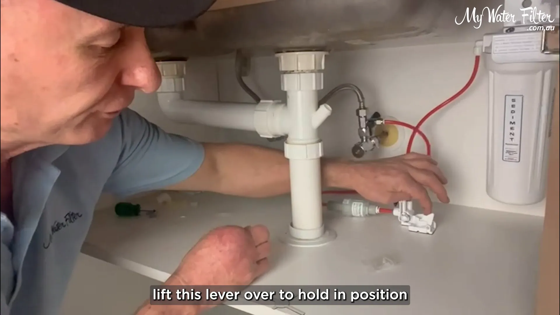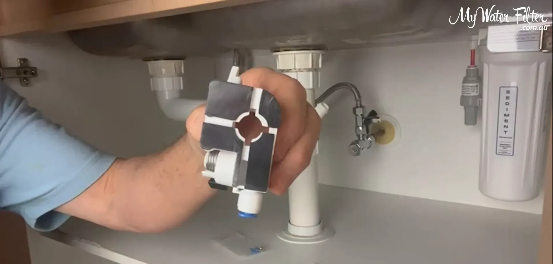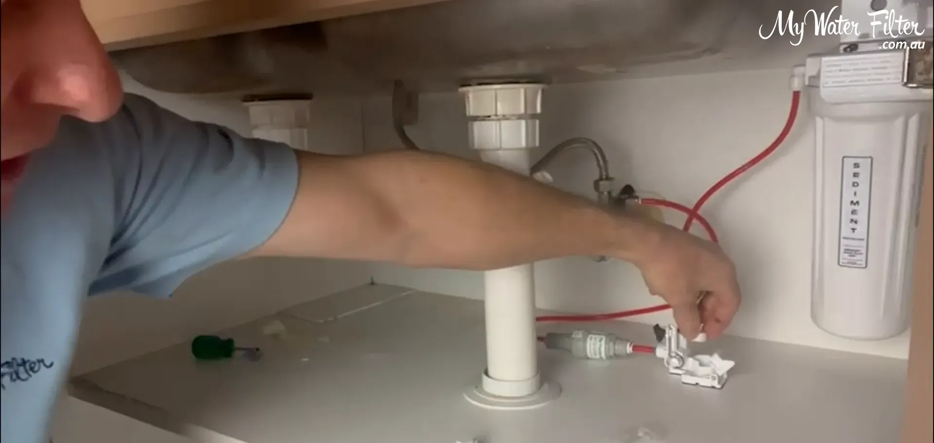 We always locate the lowest point in the cupboard so any escaping water will flow to the detector. A quick trick: drop a little water and watch where it pools. In our example the water tracked to the back area in front of the filter and T‑piece.