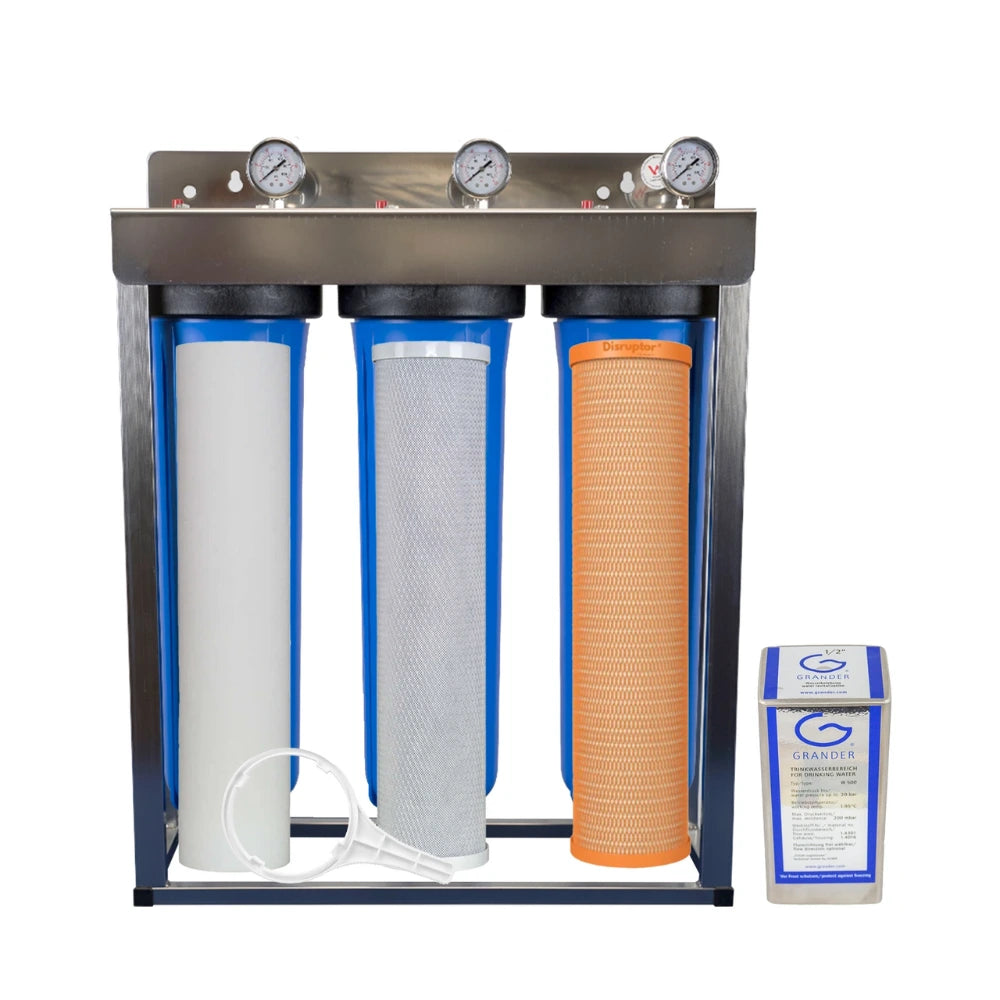 This whole house system is for those people who want the best protection possible from a whole house water filter. For people who are serious about reducing the amount of chlorine, chloramine, PFAS chemicals, heavy metals & other nasty contaminants they have in their water supply. Combining the superior filtration power of a sediment cartridge, followed by a carbon block cartridge and then the specialty Disruptor cartridge. A strong robust water filter that is specifically designed for places where high flow rate is required whether on your home, commercial or industrial use.